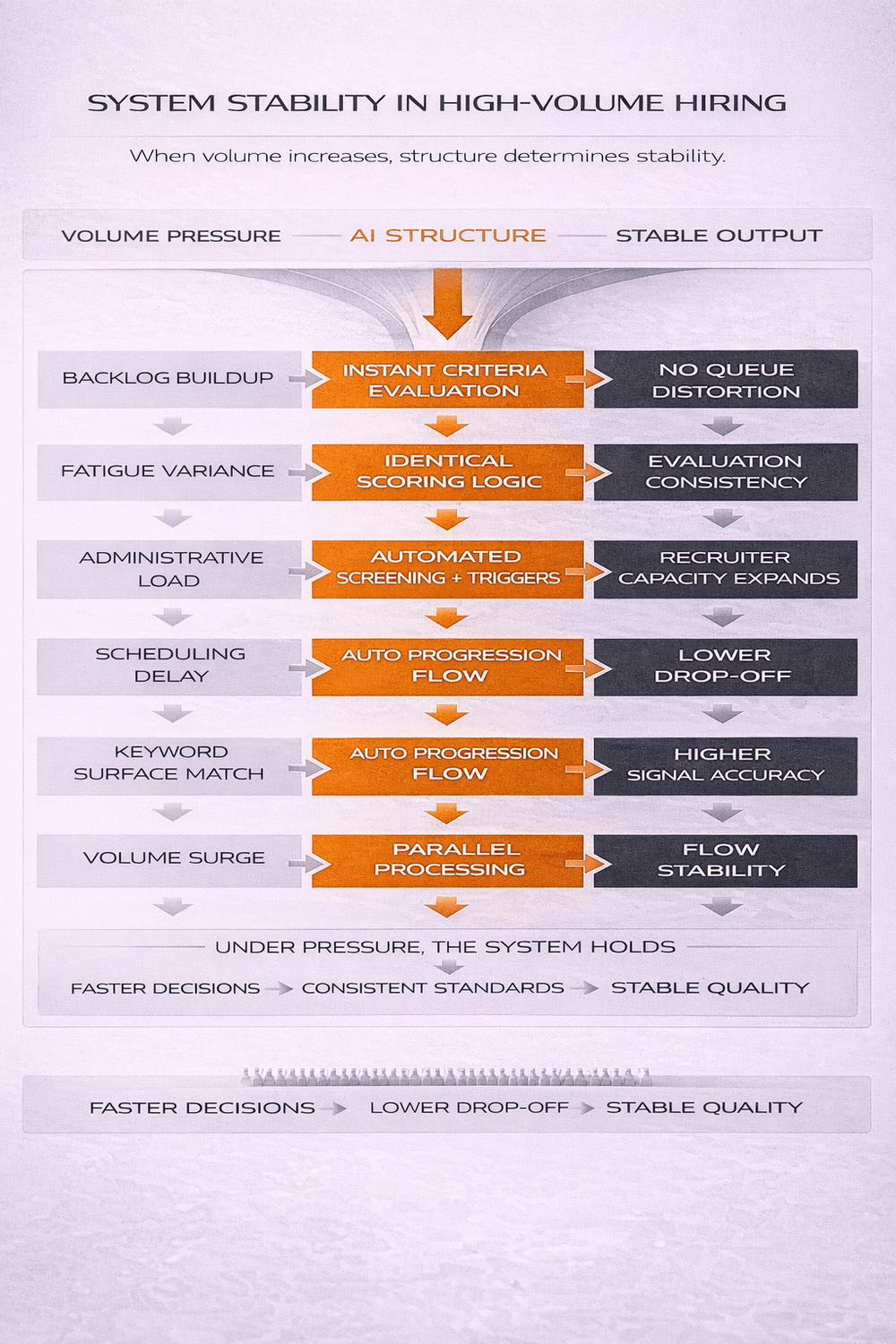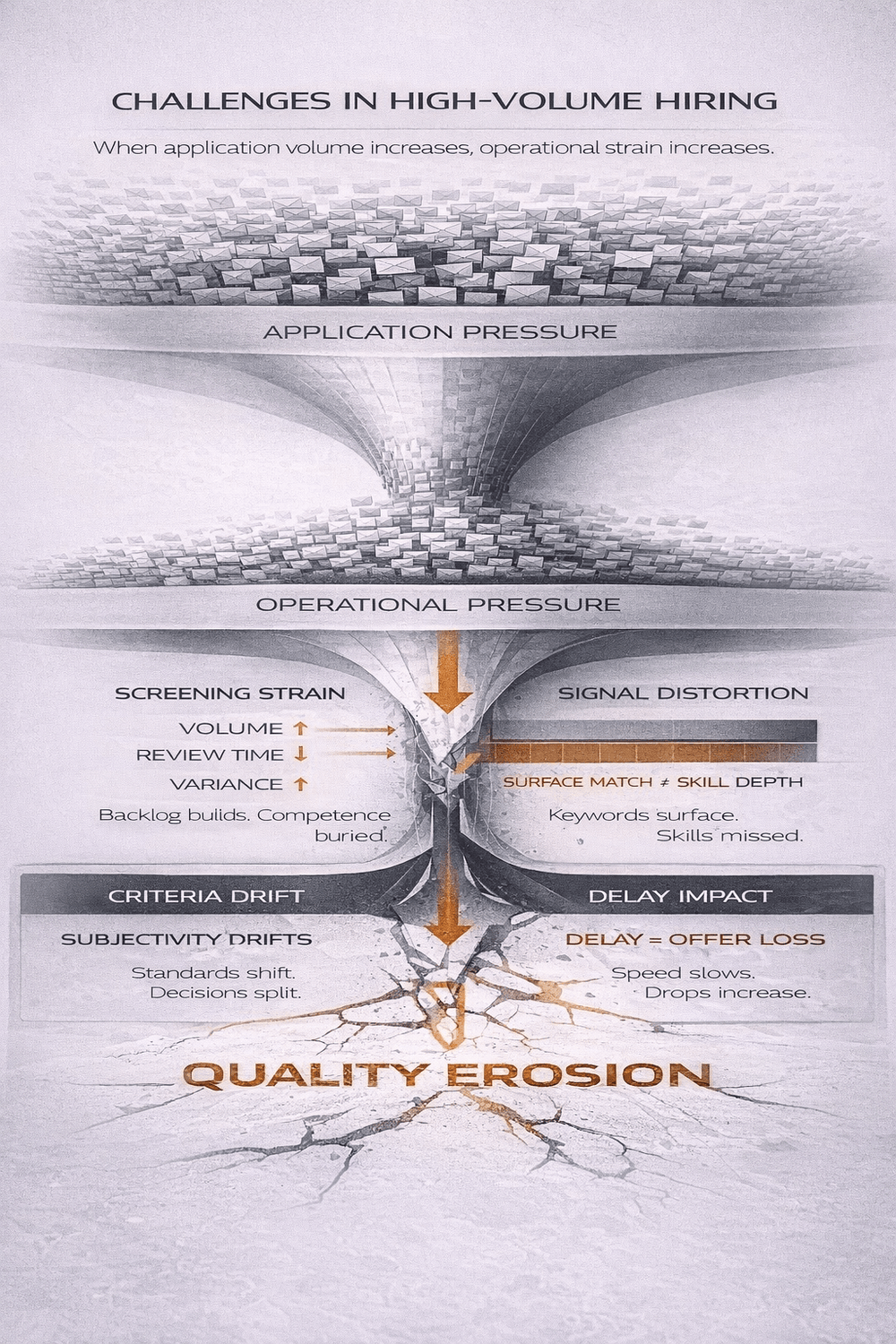High-volume hiring becomes sustainable only when evaluation moves from sequential screening to structured, parallel logic.