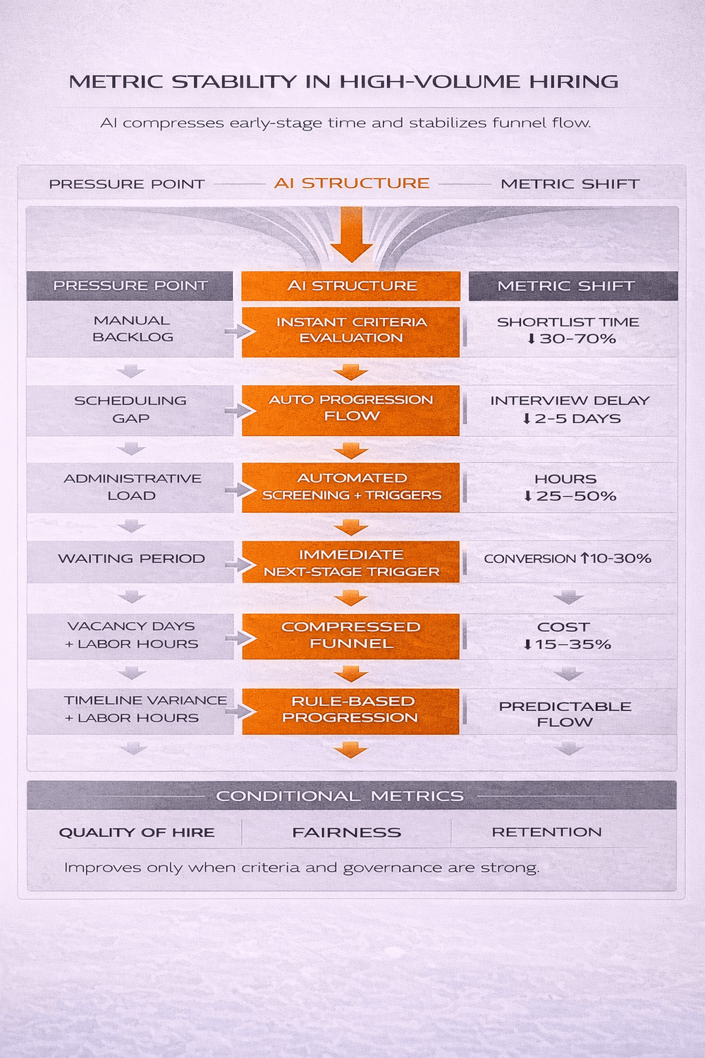 AI improves high volume hiring by reducing application processing time, increasing screening consistency, and stabilizing conversion rates under volume pressure.
