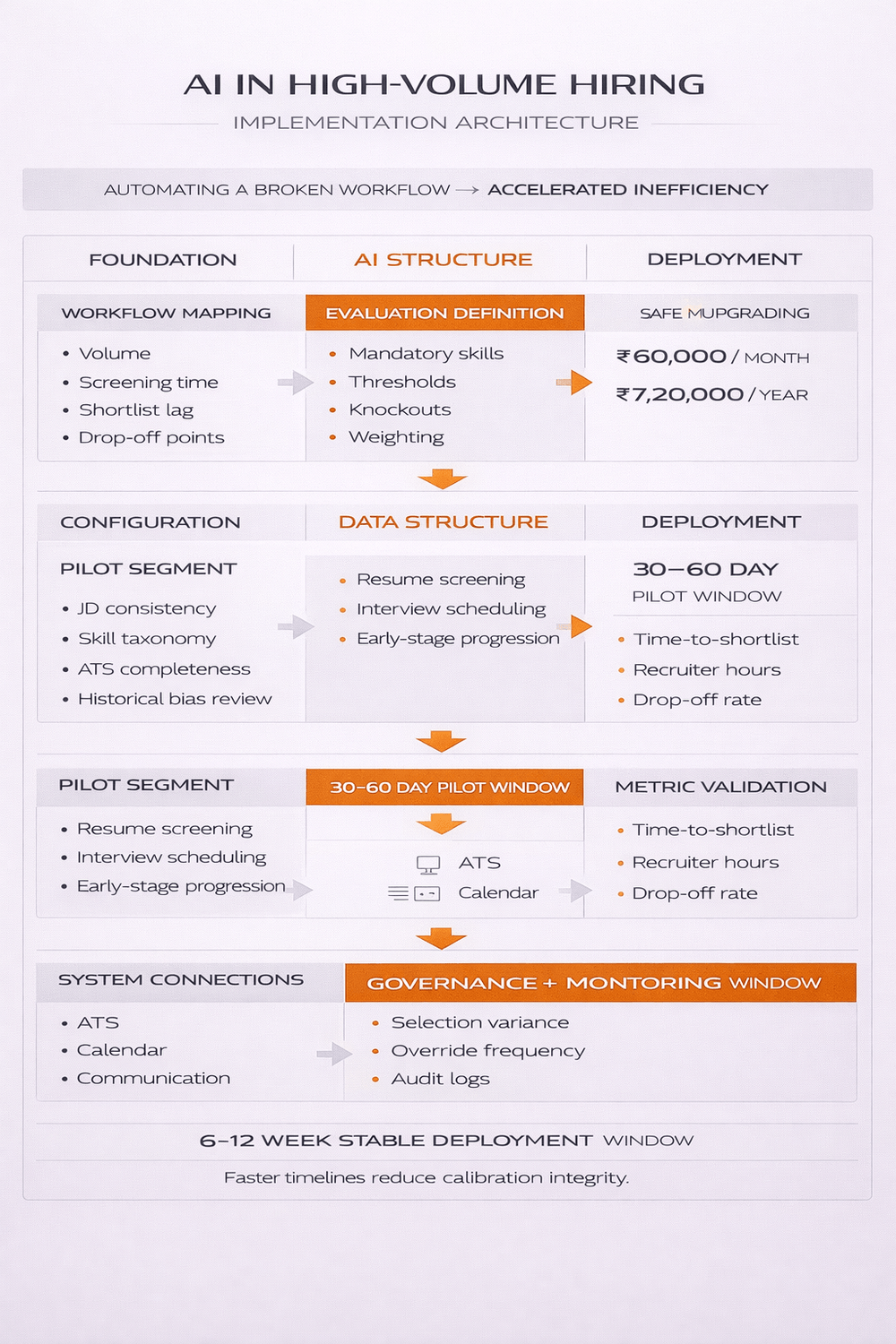 Successful implementation of AI in high-volume hiring requires workflow redesign, defined evaluation criteria, clean data inputs, and staged deployment; moreover, technology alone does not relieve scale pressure. Process structure determines success.